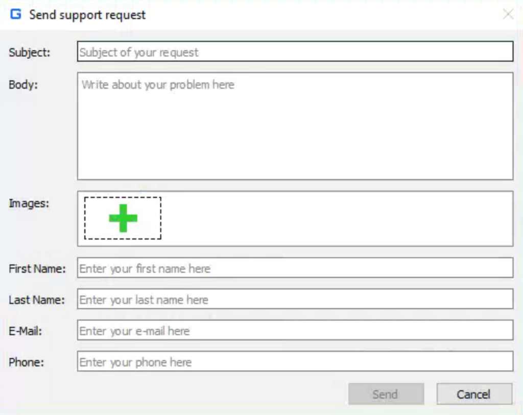 1. In your task bar (menu bar on Mac), click the “G” icon. 2. Click “Submit Ticket”. 3. A window will open requesting information for the ticket.